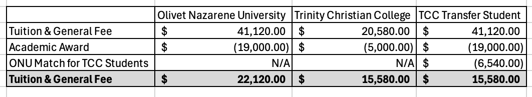 The ONU-TCC tuition and general fee match ensures that what you paid for tuition and general fee will be the same at Olivet through May 2027. We will accomplish this by giving you additional Olivet/foundation funding to meet your current tuition and general fees. After May 2027, you will still receive all of your ONU funding. However, if tuition and/or the general fee increase in future years, you will be responsible for the increase going forward. For example, if you pay $500 for the year for tuition and general fee at TCC currently, you will pay $500 for tuition and general fee at Olivet through May 2027 (the 2026-27 school year fall and spring semesters). If tuition/general fee goes up by $500 for the 2027-28 school year, then your cost for tuition and general fee will be $1,000 for that year at Olivet. Any students who begin in Spring of 2026 (this coming January) will be grandfathered in…we will match tuition and general fee for both, spring 2026 and fall/spring 2026-27.