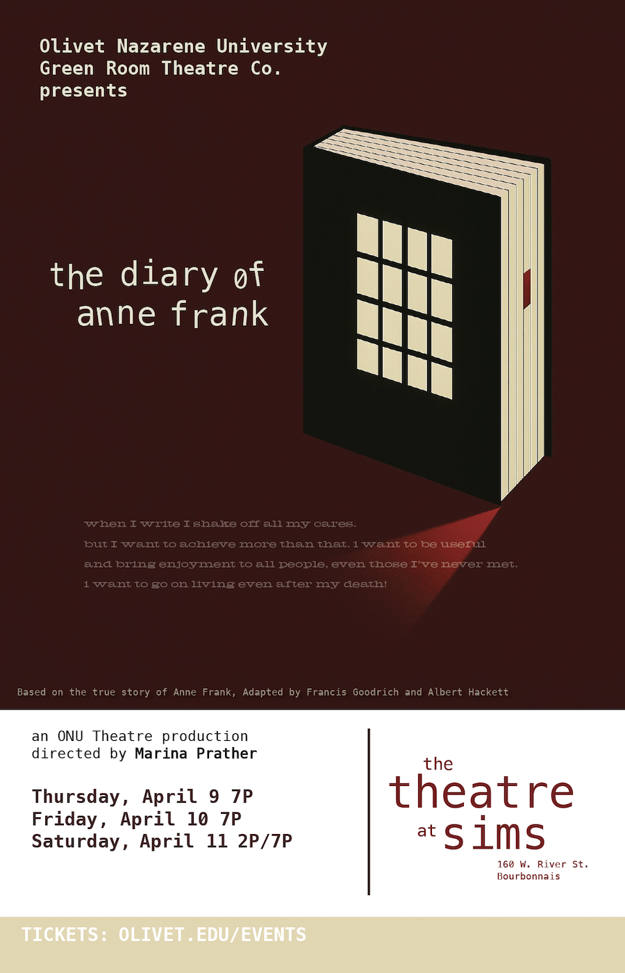 Under the Direction of student, Marina Prather ’26, Green Room Theatre Company is proud to present, The Diary of Anne Frank!