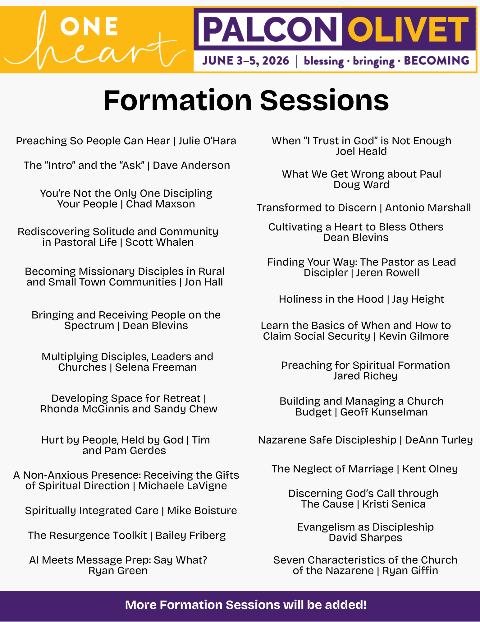 COUNSELING – Members of the Olivet counseling team, as well as other trained professionals will be on hand to meet one-on-one with pastors to provide a space for pastors to talk about personal challenges and offer wise counsel and direction for your ministry context.