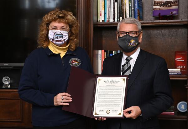 Wanting to honor the distinguished career of University President Dr. John C. Bowling, Illinois state representative Lindsay Parkhurst presented him with a resolution from the Illinois House of Representatives on Wednesday, November 18.