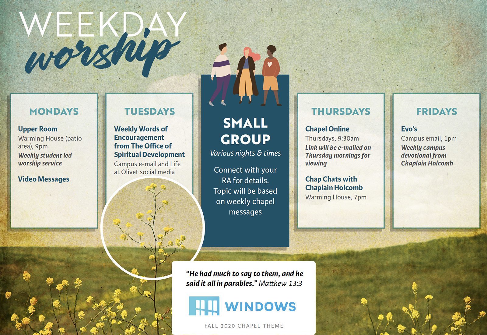 Chaplain Holcomb developed supplemental weekday touchpoints for the campus community which include Upper Room (student-led worship service on Monday nights); weekly words of encouragement (via campus email and Life at Olivet social media on Tuesdays); small group curriculum (led by resident assistants); Chap Chats (time of conversation with Chaplain Holcomb on Thursday evenings); and a weekly email devotional (on Friday afternoon).