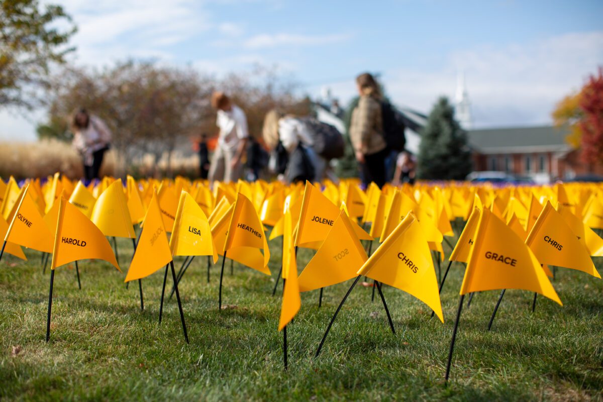 Following the service, guests were greeted by nearly 6,000 purple and gold flags on the Hawkins Centennial Chapel lawn. The purple flags, creating the letters ONU, represented the Olivet student population. Surrounding them were over 3,000 gold flags representing alumni, family and friends who made a gift in support of athletics, scholarships or academics. In total, there was one gift for every student.