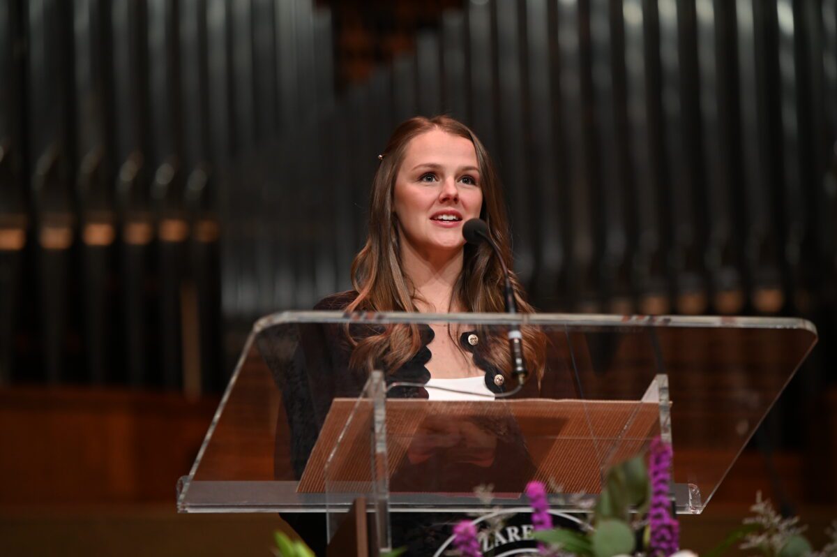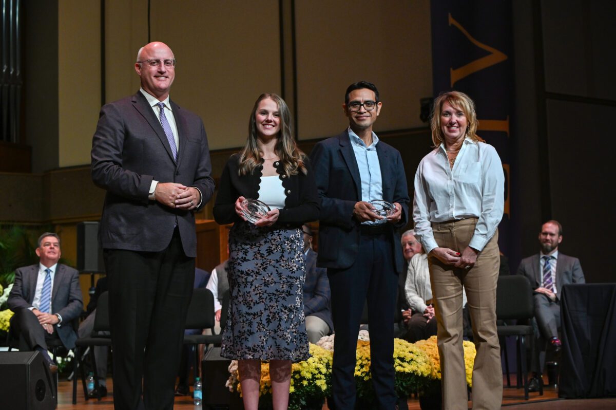 On Friday morning, the greater Olivet community gathered for a time of worship during Homecoming Chapel. During the service, Young Alumni Award recipients Julie (Pilaczynski) Gulledge ’15, J.D., and Camilo Giraldo ’13 were recognized and gave testimony to the role of their faith in their professional careers.