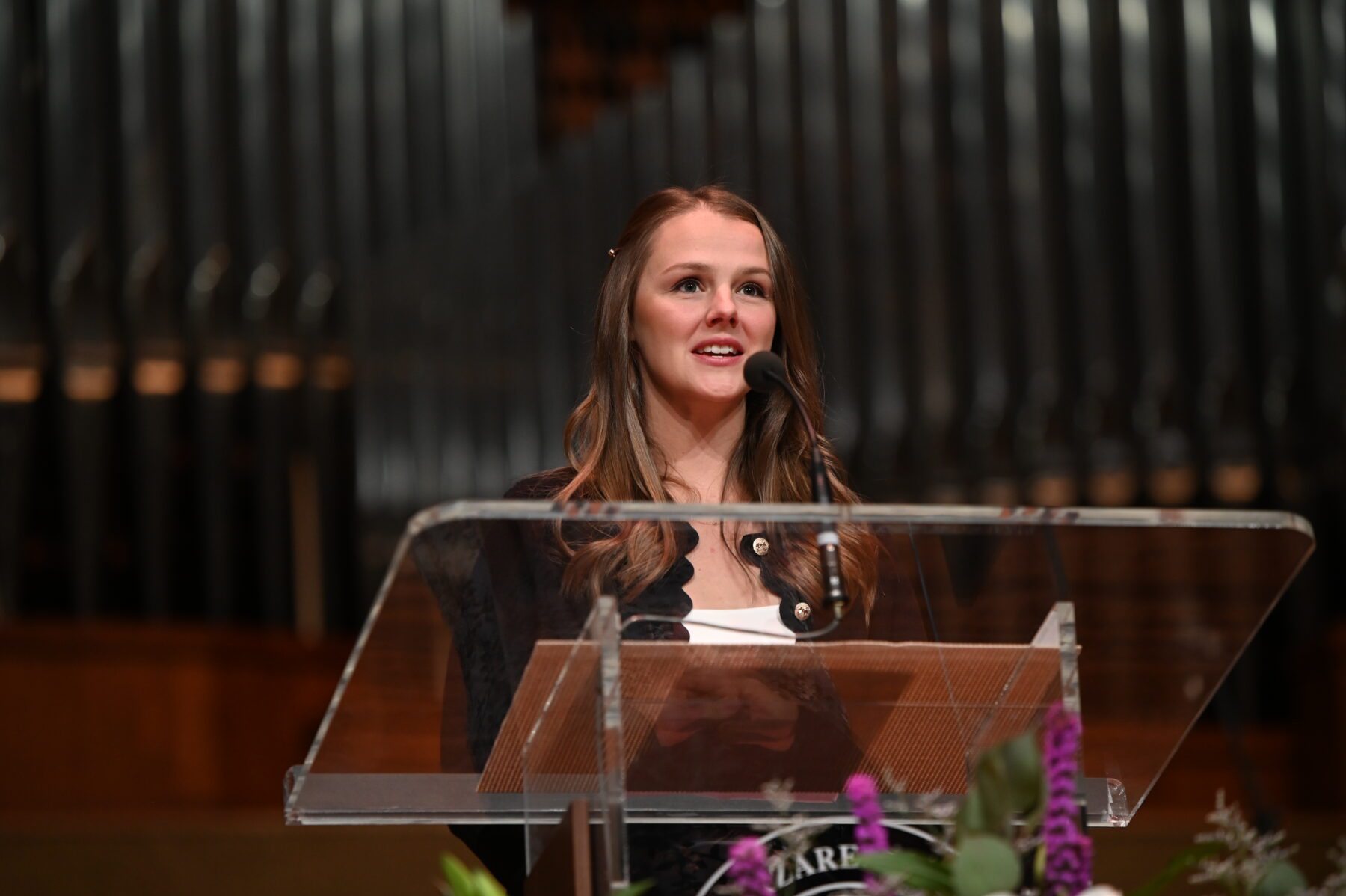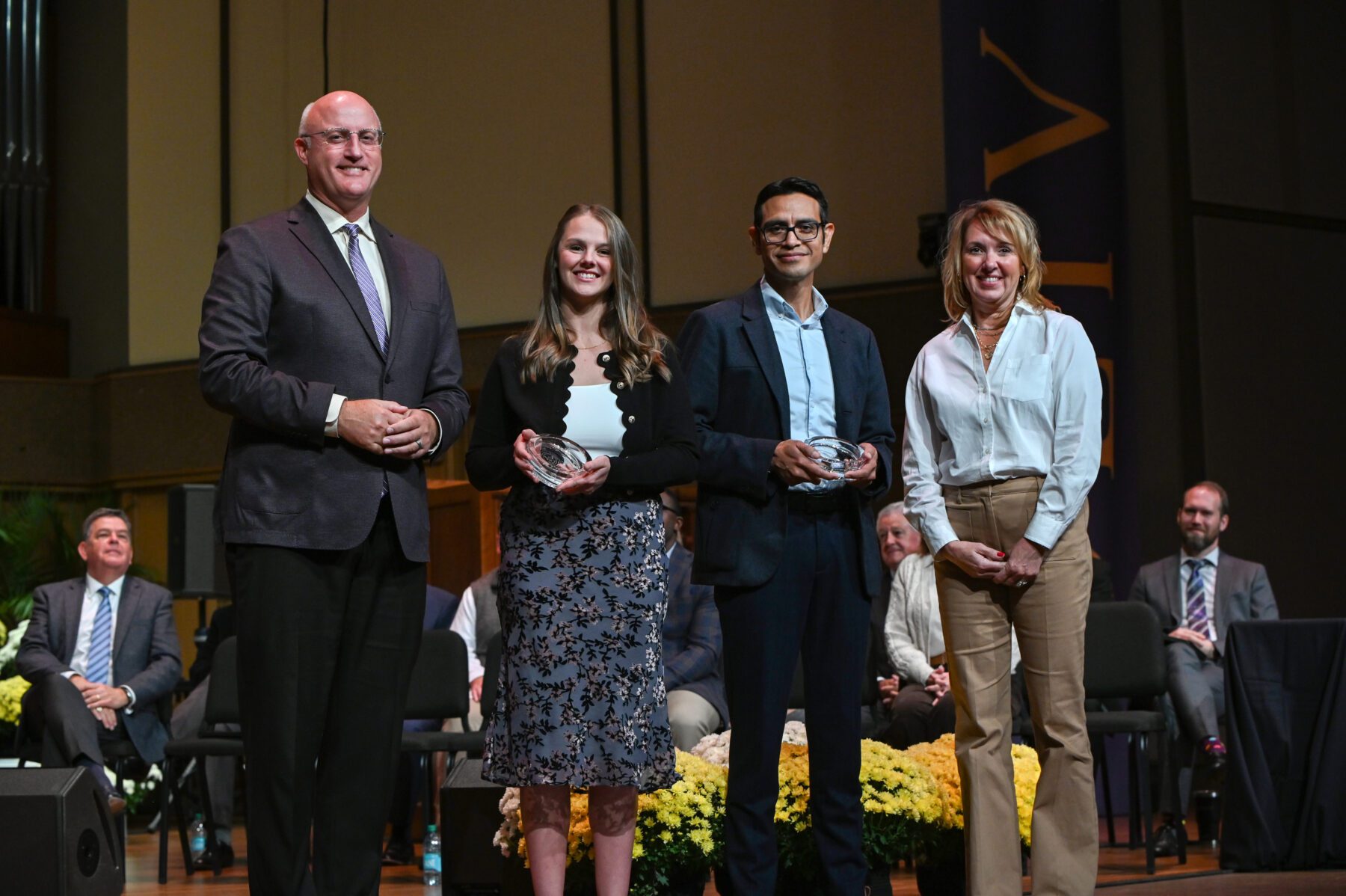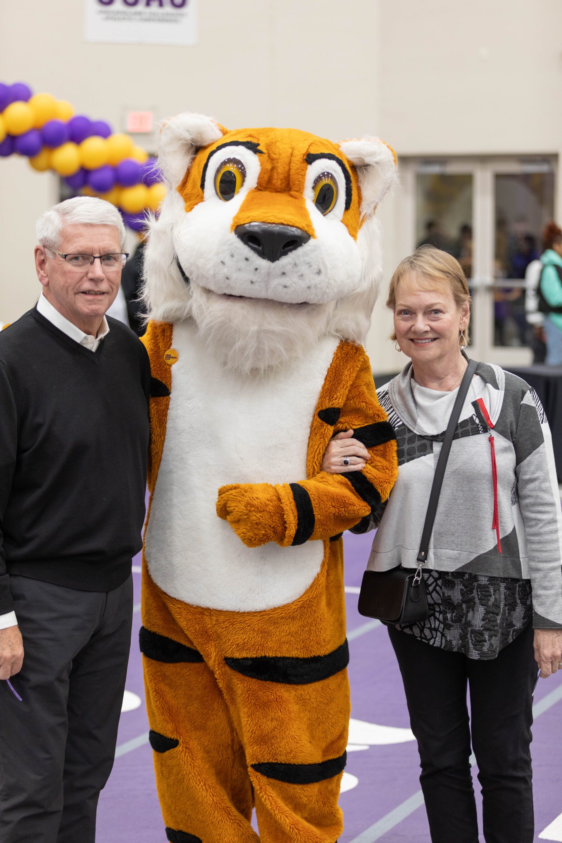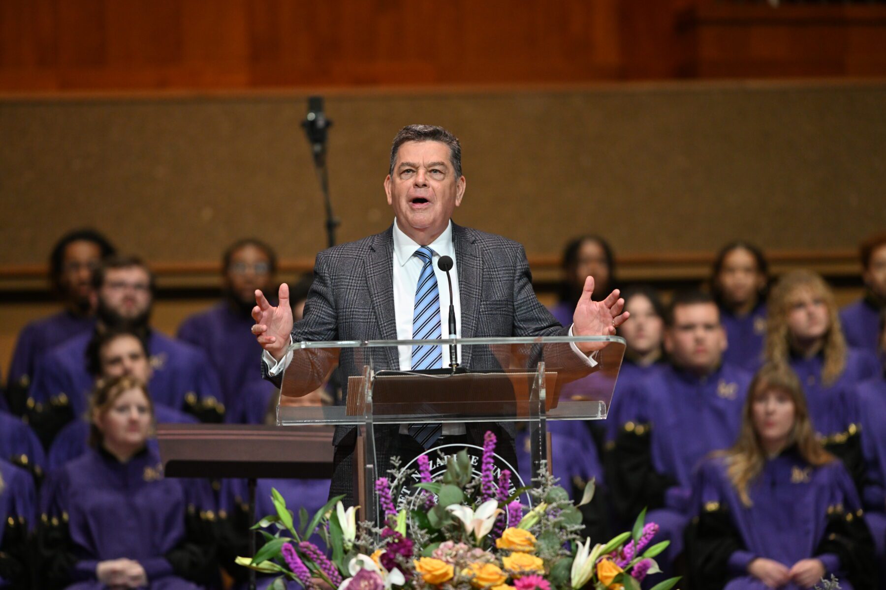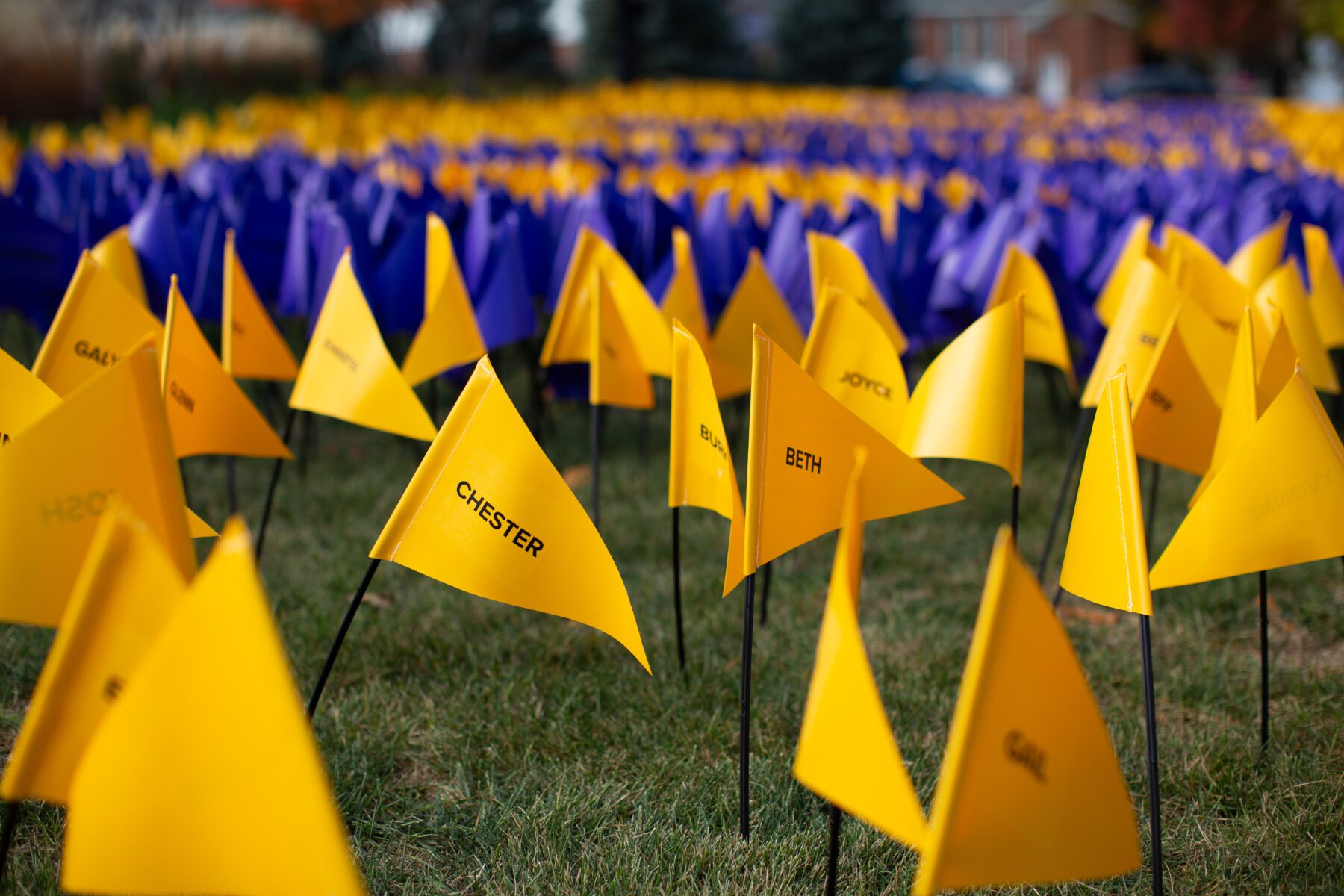 Following the service, guests were greeted by nearly 6,000 purple and gold flags on the Hawkins Centennial Chapel lawn. The purple flags, creating the letters ONU, represented the Olivet student population. Surrounding them were over 3,000 gold flags representing alumni, family and friends who made a gift in support of athletics, scholarships or academics. In total, there was one gift for every student.