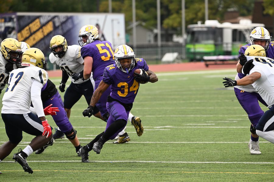 Olivet Football running off the field after planting a Tiger flag in the fieldFamily fun zone at Hoecoming