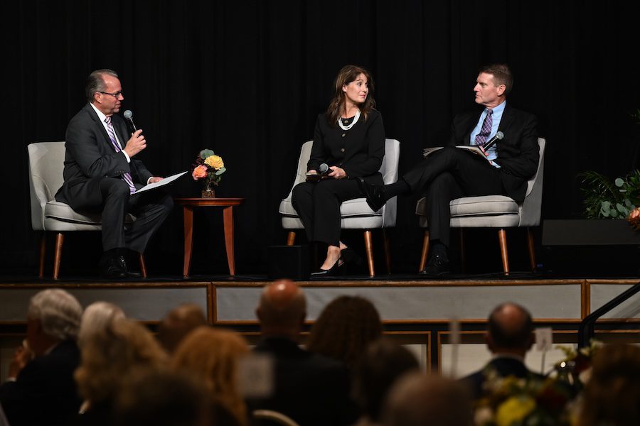 To conclude the event, First Lady Tammy (Salyer) Chenoweth ’89 and student ministry leaders Chloe Ashcraft and Laney Glueck hosted a time of prayer and thanksgiving for the campus community of Olivet Nazarene University.