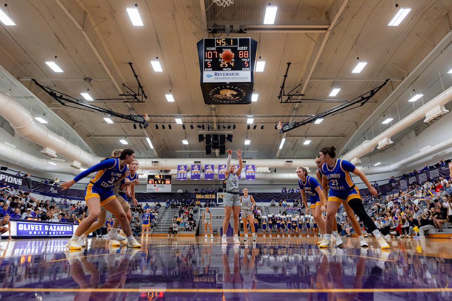 Olivet Women's Basketball player celebratingOlivet men's basketball player shooting a free throw