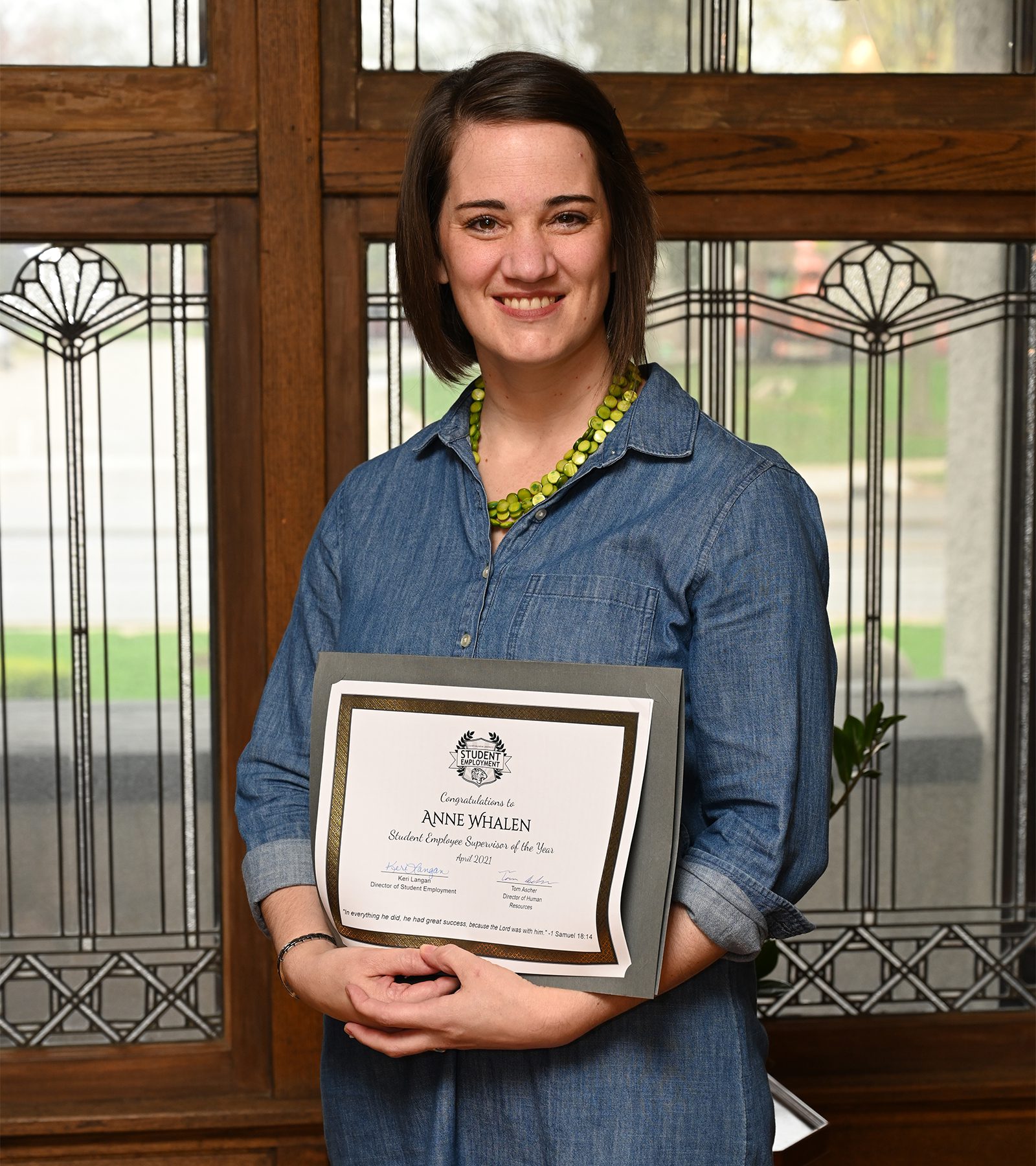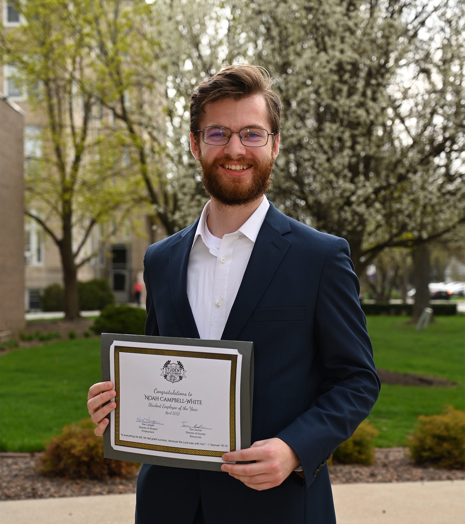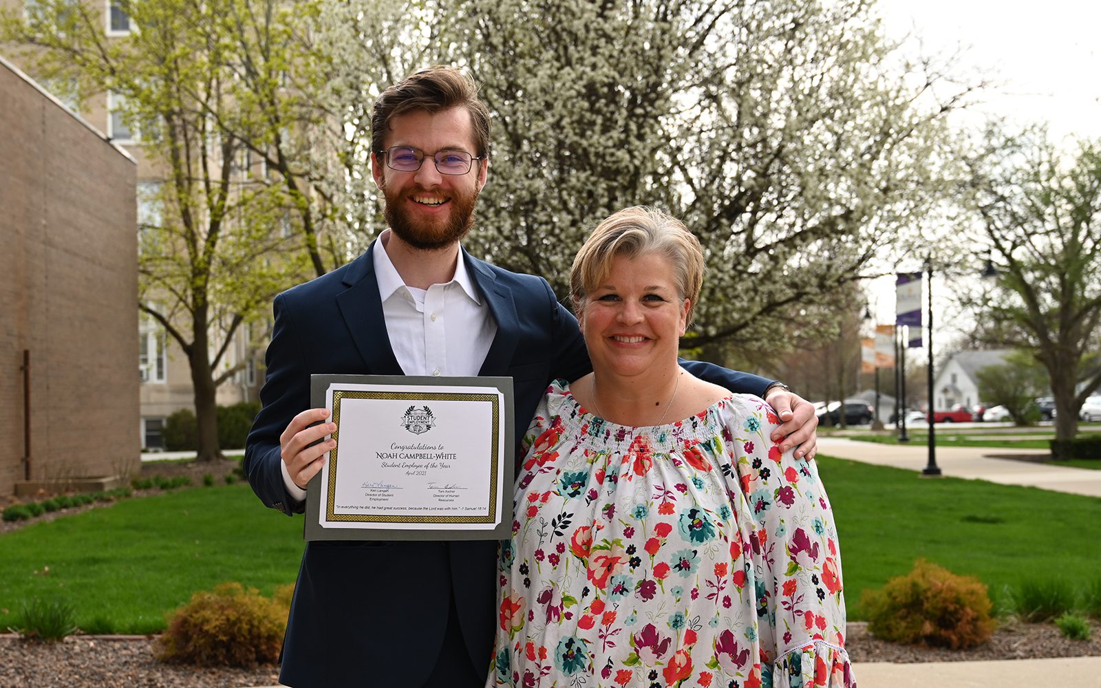 On April 7, 2021, Olivet Nazarene University recognized senior Noah Campbell-White as Student Employee of the Year and Anne Whalen as Student Employment Supervisor of the Year for 2021. The Office of Human Resources coordinated surprise celebrations for both Noah and Anne and the departments in which they work.