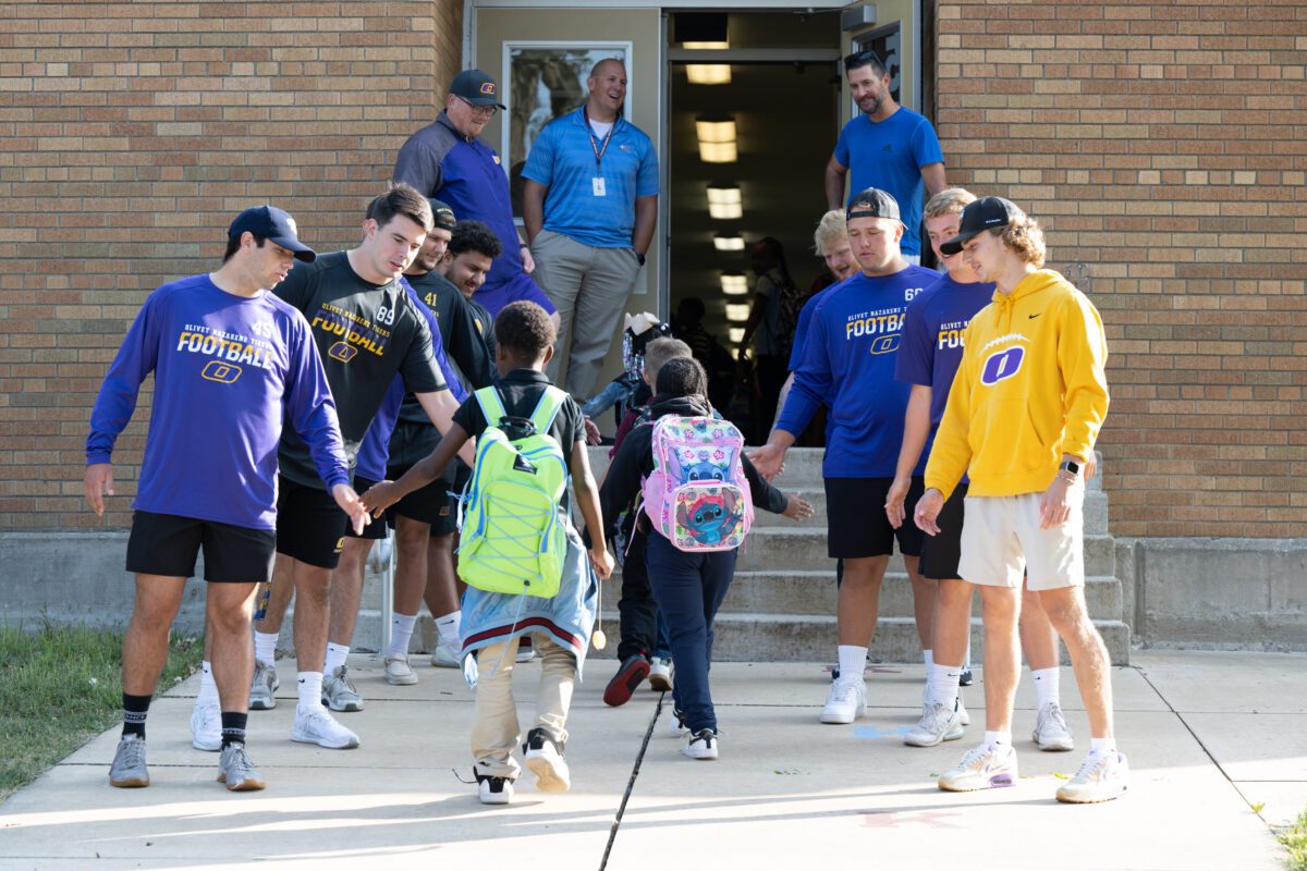 This past fall, the Olivet football team showed up well both on the field and in the community. Through a partnership with Kankakee School District 111, members of the team regularly provided a spirited welcome to elementary students at Edison Primary School, sharing high fives and enthusiastic words of encouragement with young children as they got off the bus and entered the school.