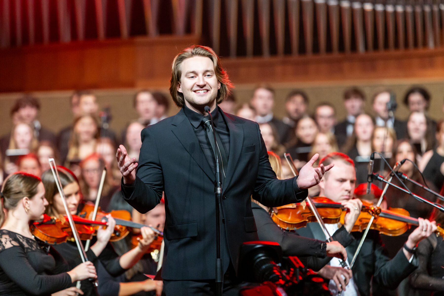 Andrew McBurnie sings his solo for the Homecoming Concert.