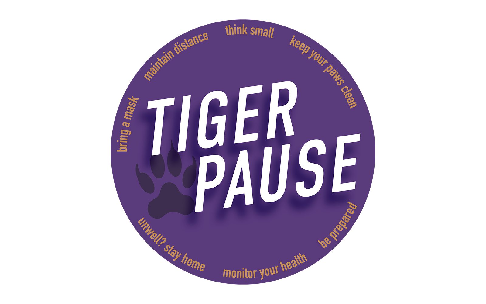Tiger Pause signage will be posted around campus to remind students, faculty, staff, and visitors of the importance of simple actions including wearing a face covering, keeping the “paws” clean, and maintaining a social distance of 6-feet whenever possible.