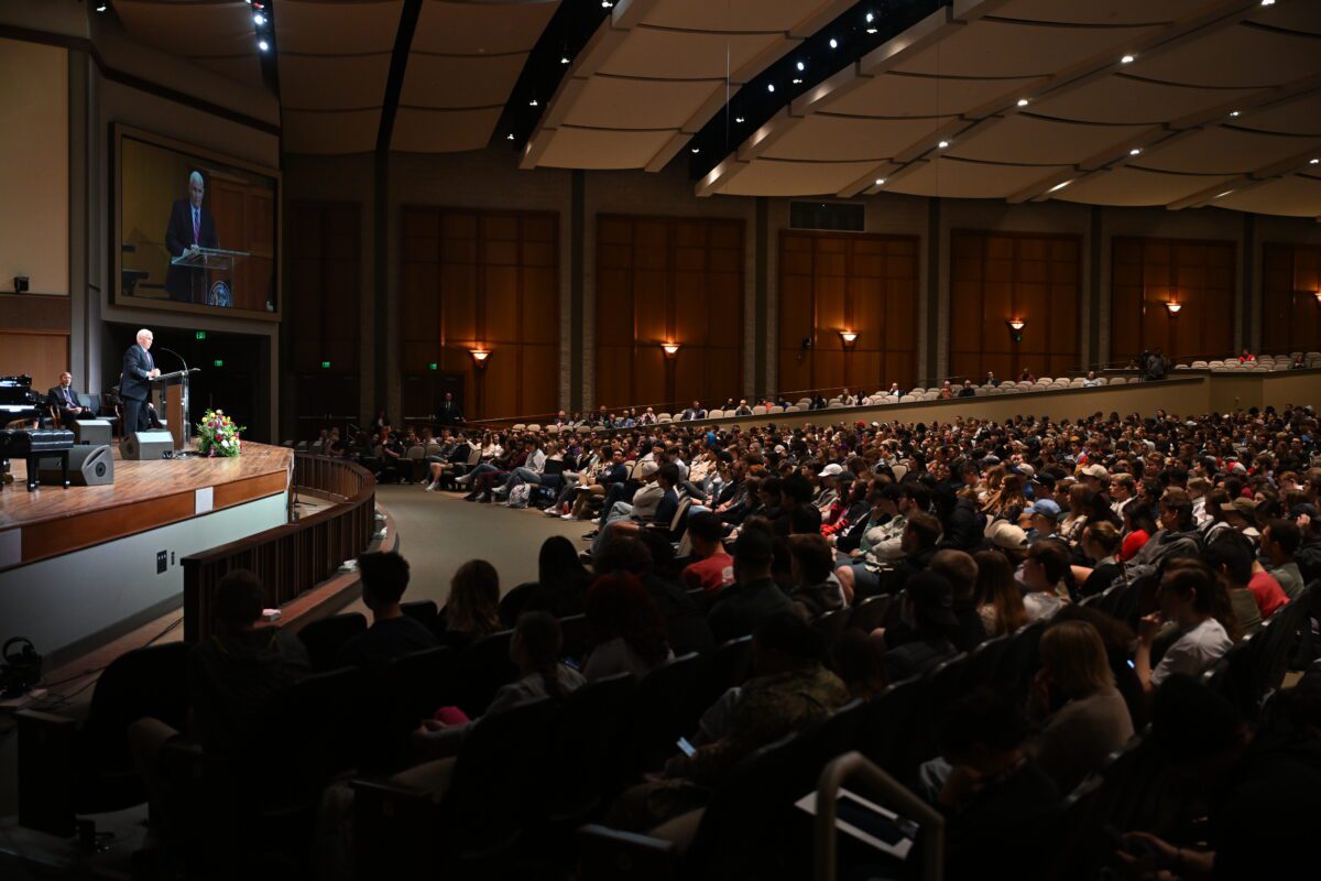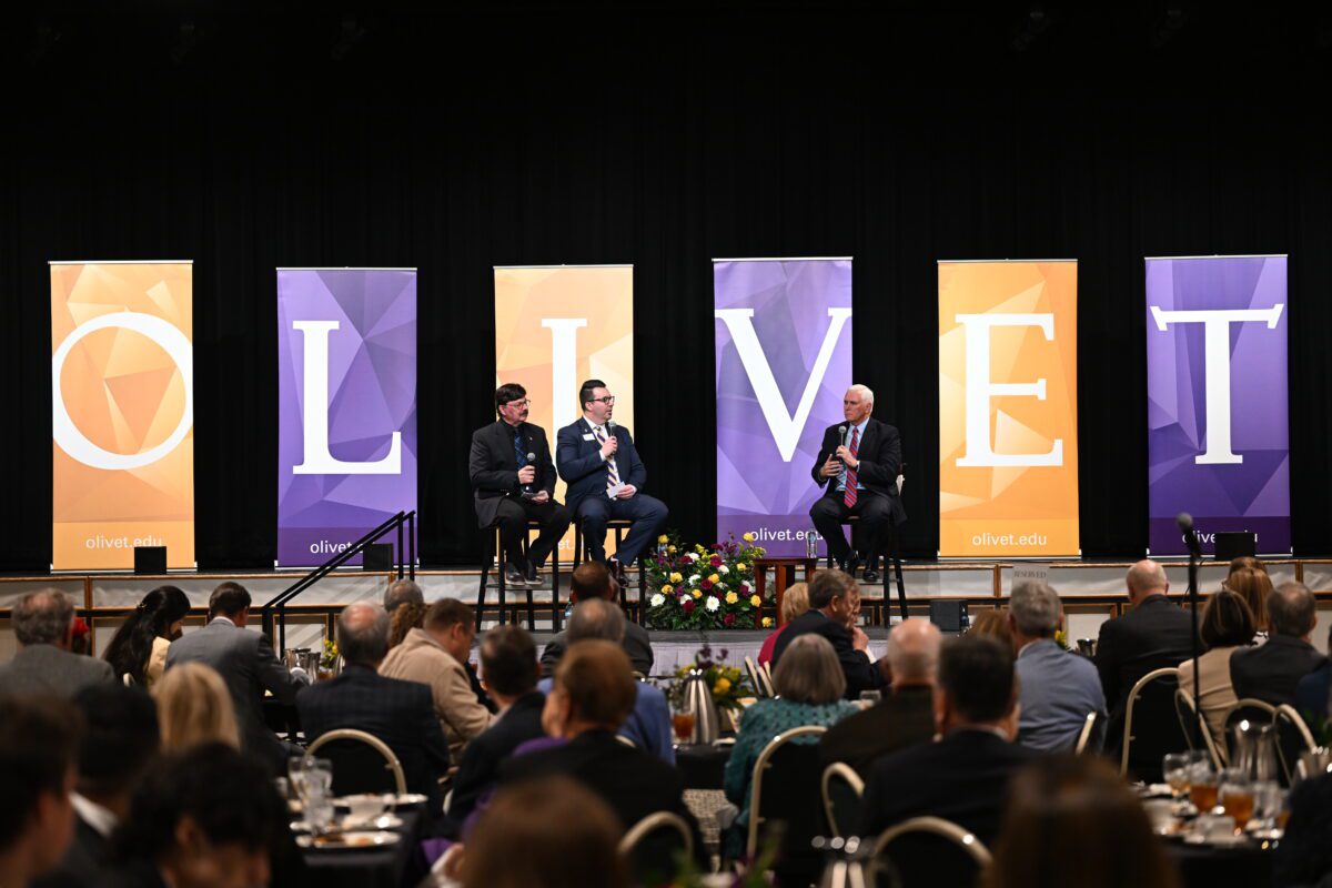 Taking the stage, Pence addressed the Olivet student body as the next generation of leaders. He encouraged them to lead with integrity and answer their calling with faith in the One who created them for such a time as this. His message on servant leadership resonated throughout a packed Hawkins Centennial Chapel, as he shared stories from his own journey in faith and politics. He concluded with a charge to students: “Aspire to be men and women of integrity. Be the kind of people this country has always relied on. But be prepared—taking a stand will bring opposition. Yet as the Bible says, ‘Always be prepared to give a reason for the hope that you have but do so with gentleness and respect.’”