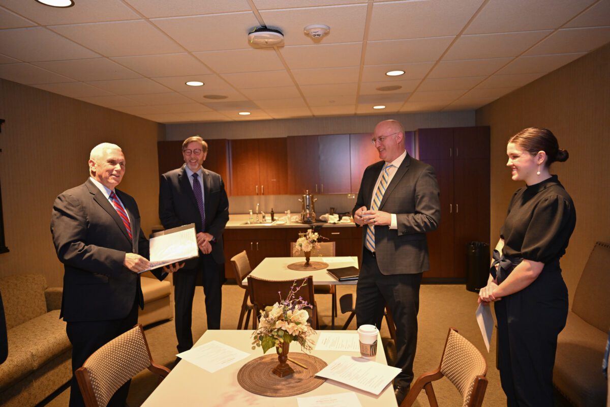 Pence joined Dr. Gregg and Tammy Chenoweth and key guests from the greater Olivet community for a private luncheon and discussion at the close of his visit. During this time of fellowship, attendees engaged in moderated discussion led by professor of legal studies and president of the Center for Law and Culture, Dr. Charlie Emmerich[,] and Senior Field Representative for U.S. Congressman Warren Davidson (Ohio’s 8th District), Zach Bohannan ’07 MA ’09[,] with a special Q&A session, providing deeper insight into Pence’s thoughts on faith-based education, leadership, and service.