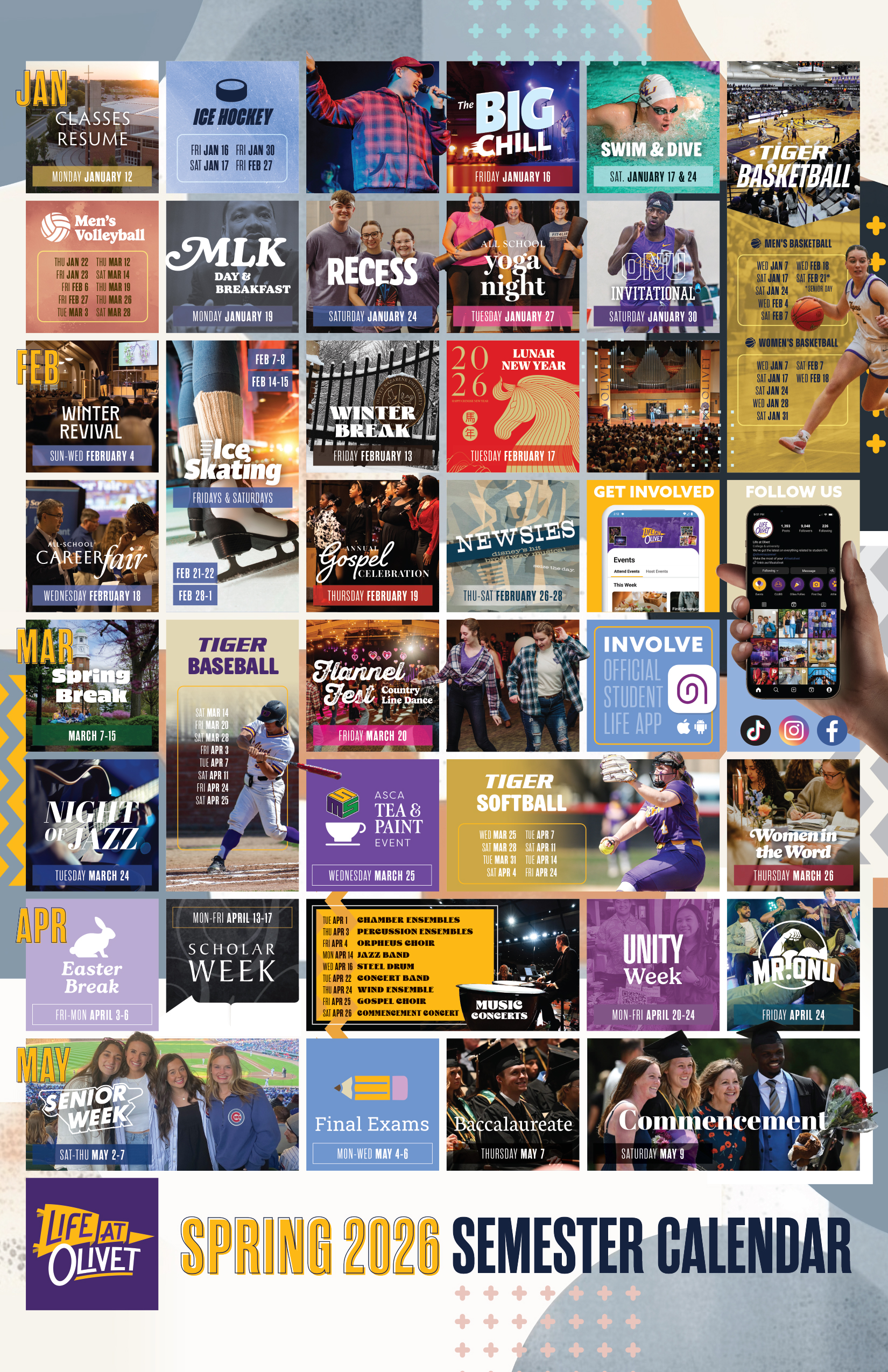 We are excited for what this new semester holds for your students as we kick off the Spring 2026 semester. While the cold temps and snow may hinder the campus community from enjoying the great outdoors, our Student Development team continues to prioritize community by creating spaces and places for indoor fun and fellowship! More details of the Student Life Calendar can be found below to encourage your student's participation. To view other University events, visit olivet.edu/events! With it being a new semester, we want to help ensure that your student feels confident about their academic work. Encourage them to connect with their professors and our Center for Academic Excellence. Our staff personnel can help support them along the way. Please take note of the following information from around campus! If you have any questions about the content or recommendations for items to include in the next bi-monthly newsletter, please email ONUcares@olivet.edu. You can also feel free to reach out with any questions or if you just need some advice, direction, or prayer!